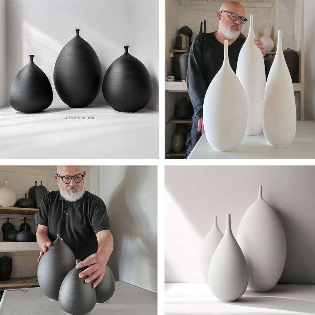 Hago jarrones decorativos y escultóricos en el torno alfarero. Cada pieza surge de la improvisación y a veces, desde un boceto: pero siempre buscando la armonía de las formas entre si. Por eso trabajo con colores neutros en su mayoría, porque la forma es lo que me interesa desarrollar en volúmenes pequeños y grandes. El diseño o la forma de cada pieza u obra, busca el juego entre la luz y las líneas dentro del espacio.